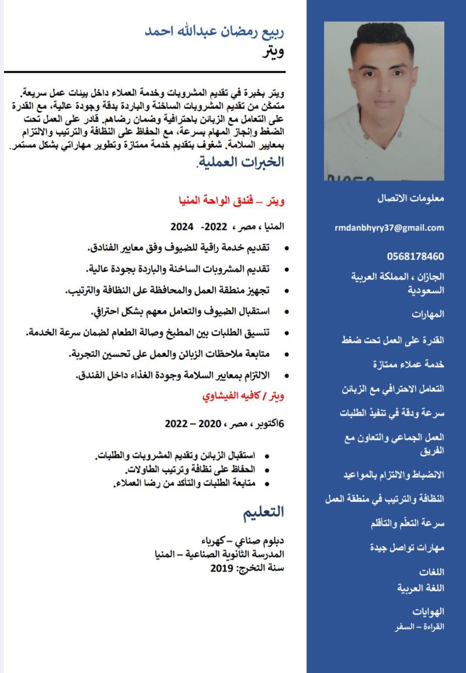 ربيع رمضان من مصر اشتغلت في عدة مطاعم والفنادق وايتر لو حد متاحه أي فرصه أنا متاحه للعمل