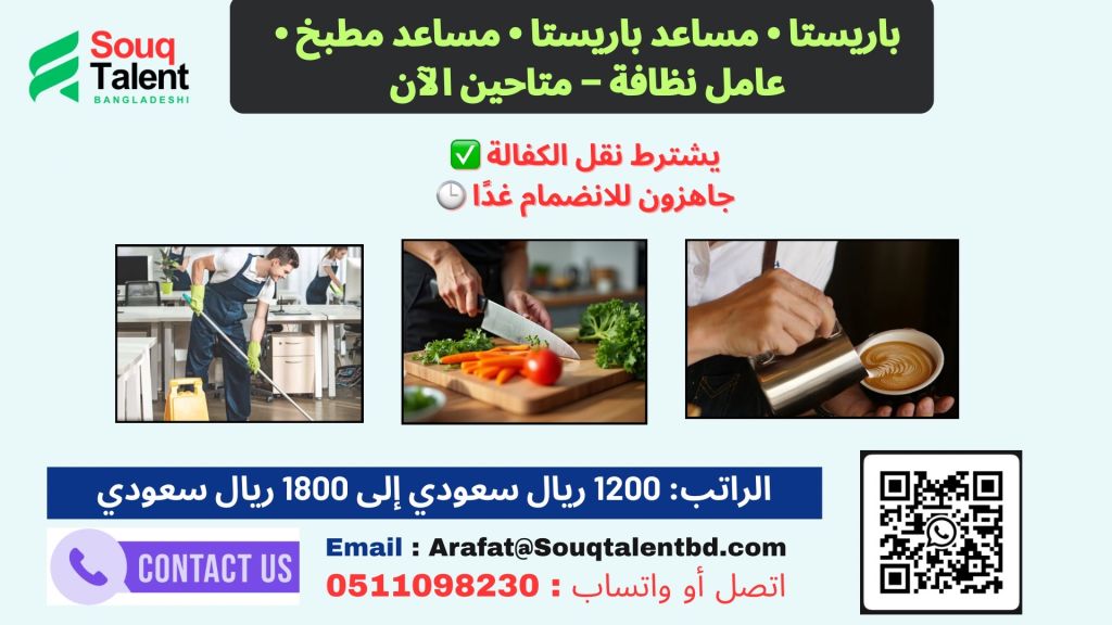 باريستا ومساعد باريستا ومساعد مطبخ وعامل نظافة متاحين الآن
