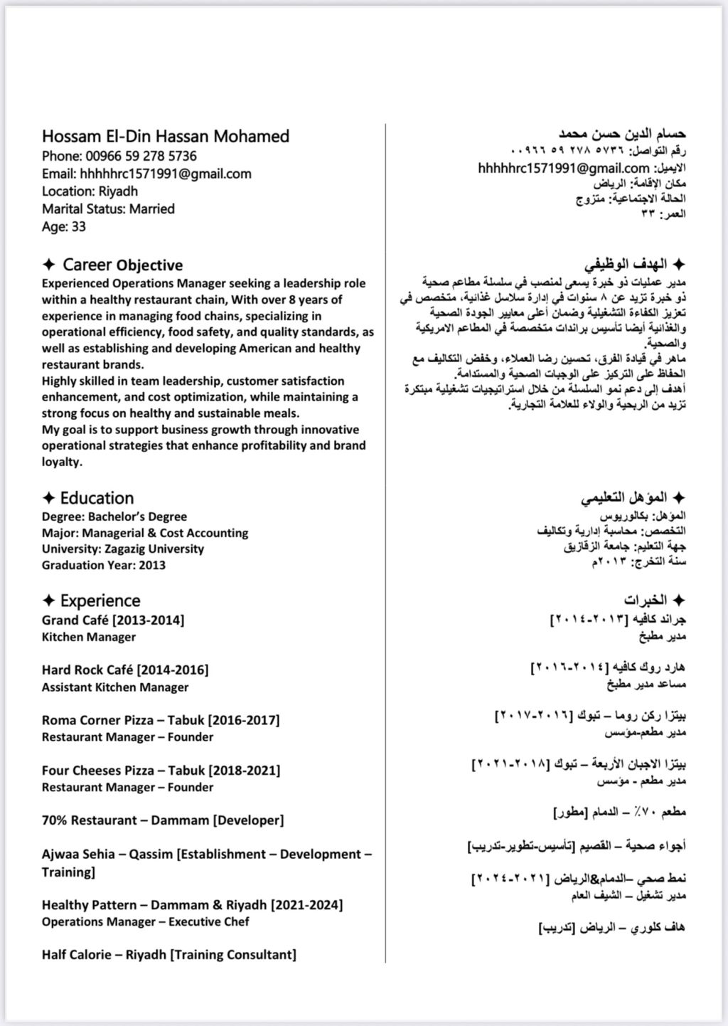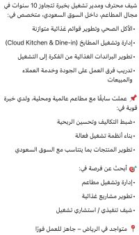 شيف عام ومدير تشغيل مطاعم ومطابخ متاح للعمل داخل الرياض