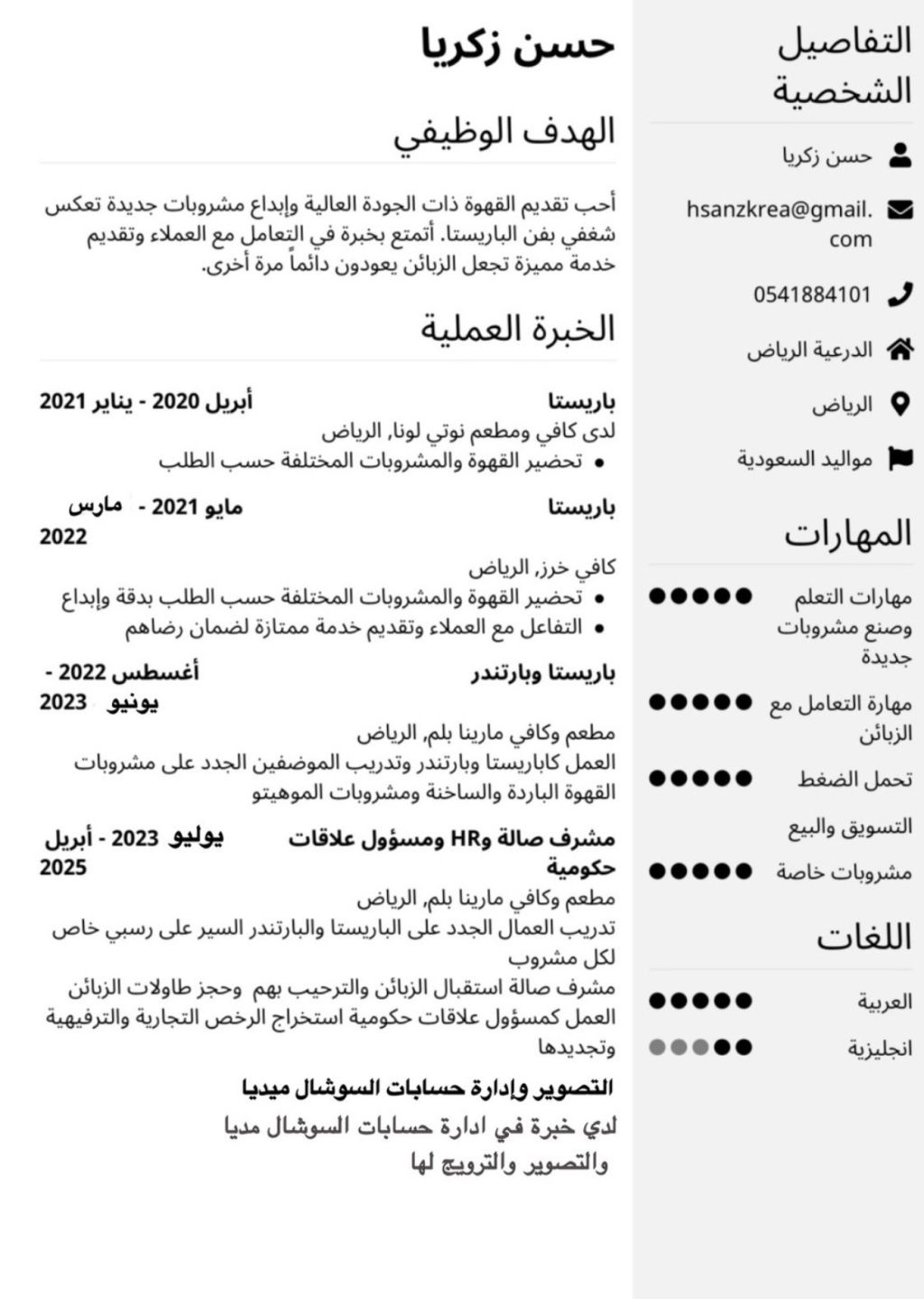 باريستا خبرة في المشروبات الساخنه والباردة من 2019 مقيم في الرياض الإقامة سارية
