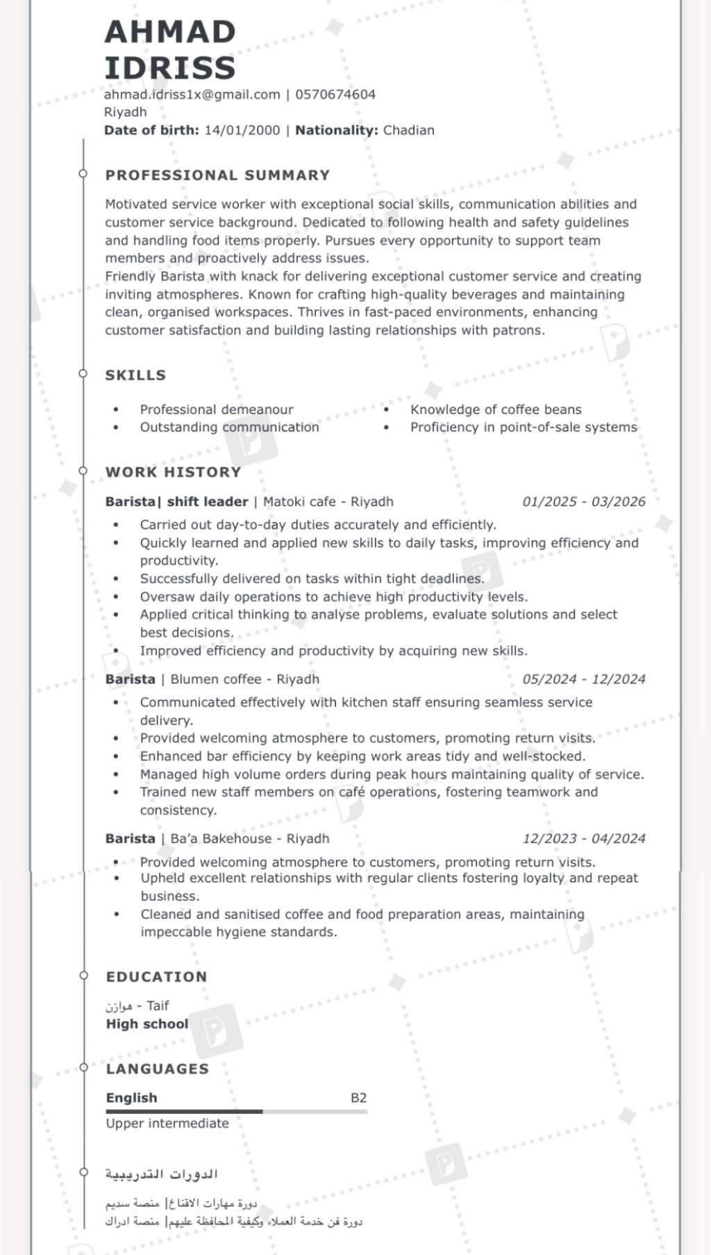 باريستا شغوف بصناعة القهوة وتقديم تجربة مميزة للعملاء. لدي خبرة في اعداد مختلف أنواع القهوة المختصة، مع مهارة في التعامل مع العملاء والعمل ضمن فريق. ابحث عن فرصة عمل أستطيع من خلالها تطوير مهاراتي والمساهمة في تقديم جودة عالية وخدمة احترافية في بيئة عمل مميزة