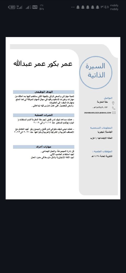 مغربي الجنسية خبرة أكثر من خمس سنوات هنا في السعودية. اشتغلت من قبل وايتر بمطعم وترقيت أصبحت مشرف صالة. حاليا اشتغل بلاونج مساعد مدير ومسؤول صالة