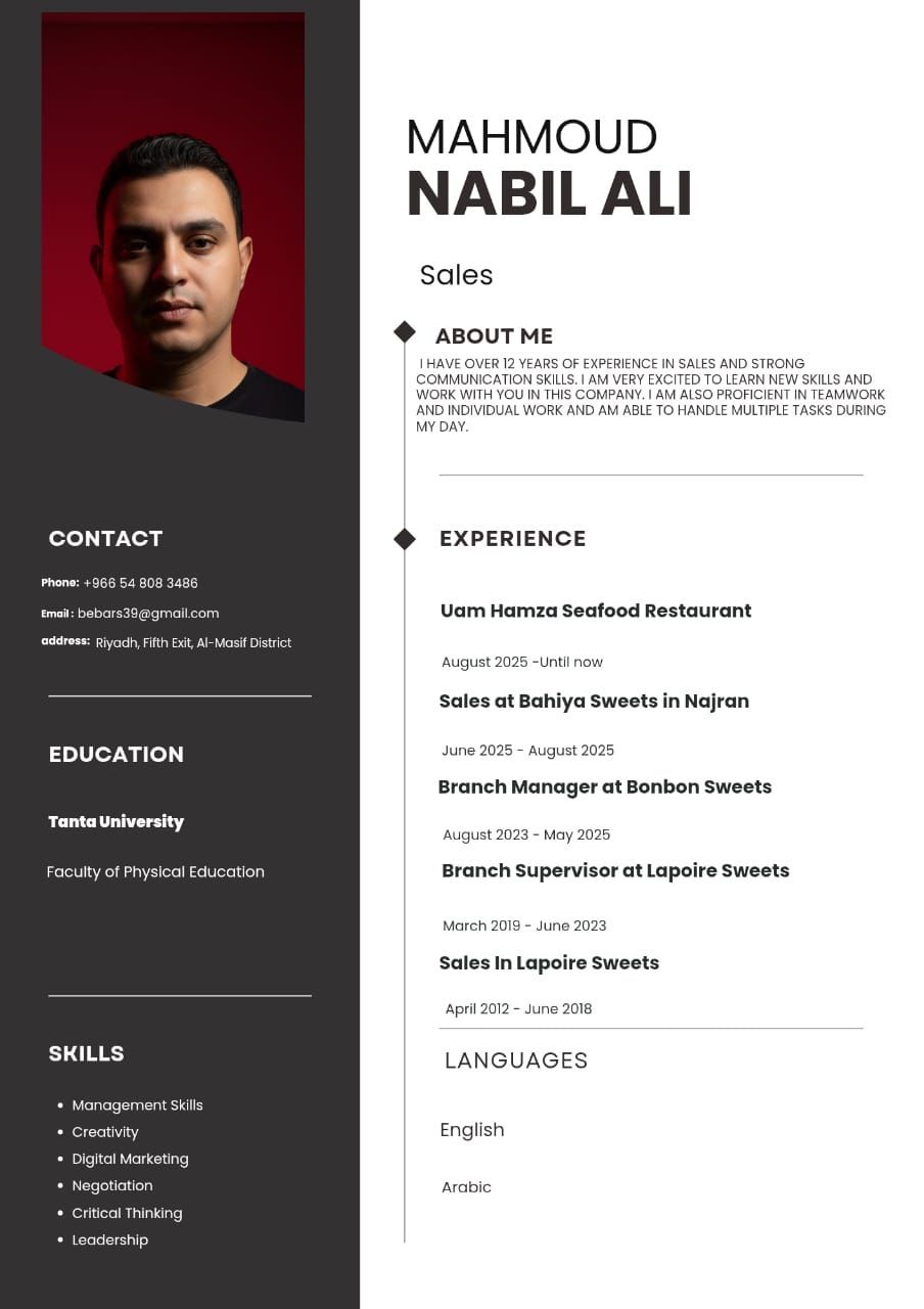 أنا اسمي محمود مصري مقيم حاليا في الرياض اشتغلت في مصر برندات حلويات مثل lapoire / Salé Sucré في مصر وفي السعودية اشتغلت في مكان بهيه في نجران ولدي خبرة كبيرة في مجال المبيعات وتحقيق الأهداف وجاهز للشغل من اليوم