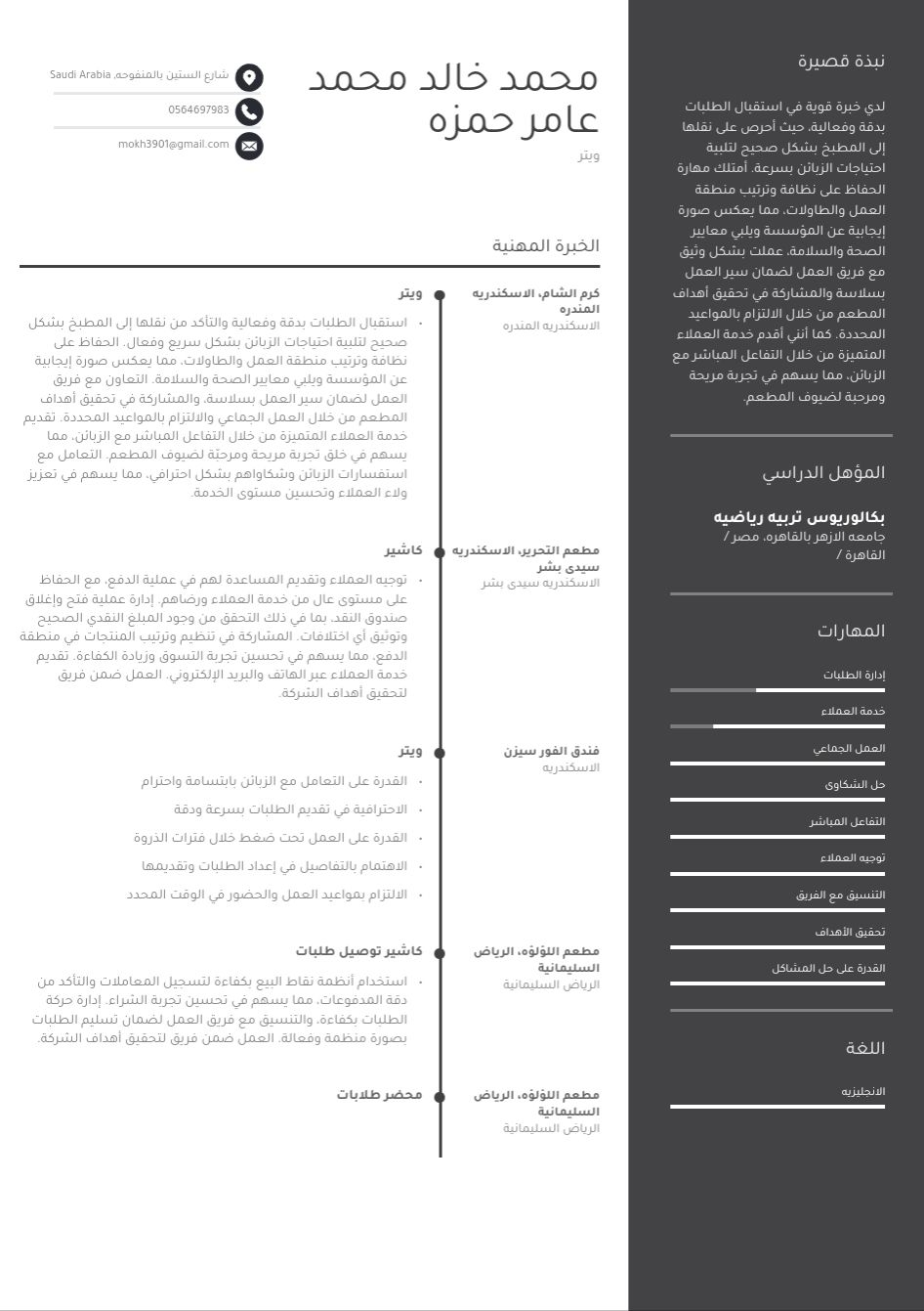 معي خبرة كبيرة في مجال المطاعم ومعي إقامة سنة سارية اشتغلت وايتر بكرم الشام في الاسكندرية واشتغلت كاشير بكشري التحرير في الاسكندرية واشتغلت وايتر بفندق الفور سيزن في الاسكندرية واشتغلت كاشير توصيل طلبات ومحضر طلابات بمطعم اللؤلؤة في السليمانية في الرياض