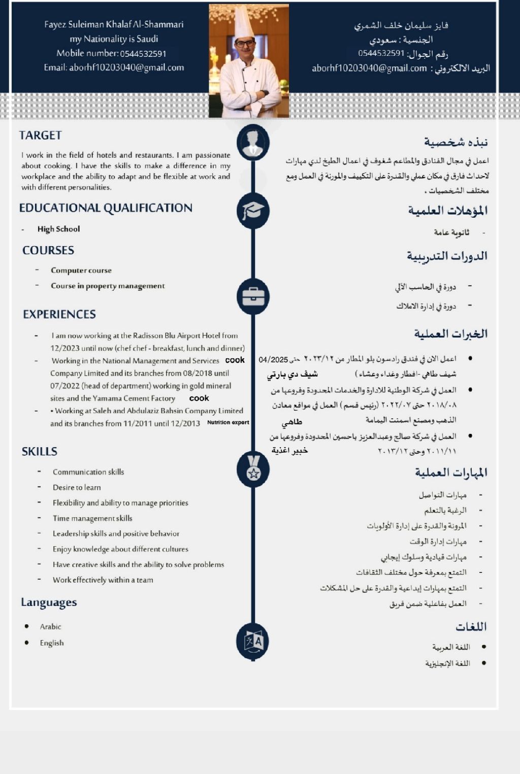 شيف طباخ ماهر يبحث عن عمل لدى الخبرة الكافيه الذلك