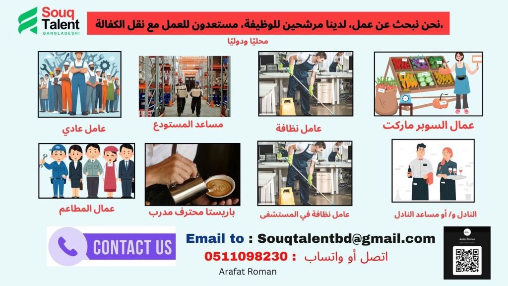 مرشحون جاهزون - إقامة قابلة للنقل عزيزي السيد، لدينا مرشحون مدربون وجدد بإقامة قابلة للنقل، جاهزون للانضمام فورا. الراتب من 1300 الى 1600 ريال حسب الخبرة. الوظائف المتاحة تشمل وايتر (نادل) عامل نظافة، كاشير، رانر، مساعد مطبخ، طباخ خط، شيف، وباريستا. يرجى إفادتنا بالوظائف المطلوبة لديكم. للتواصل تحياتي، عرفات