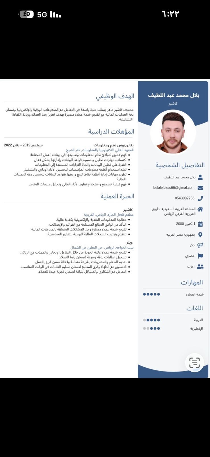 ابحث عن فرص عمل مناسبة سبق لي العمل كاشير سنة ونصف في فلافل الحارة في العزيزية علي برنامج الفودكس وأيضا سبق لي العمل وايتر في بيت الخواجة في شمال الرياض أقامه سارية وكل شيء تمام بفضل الله