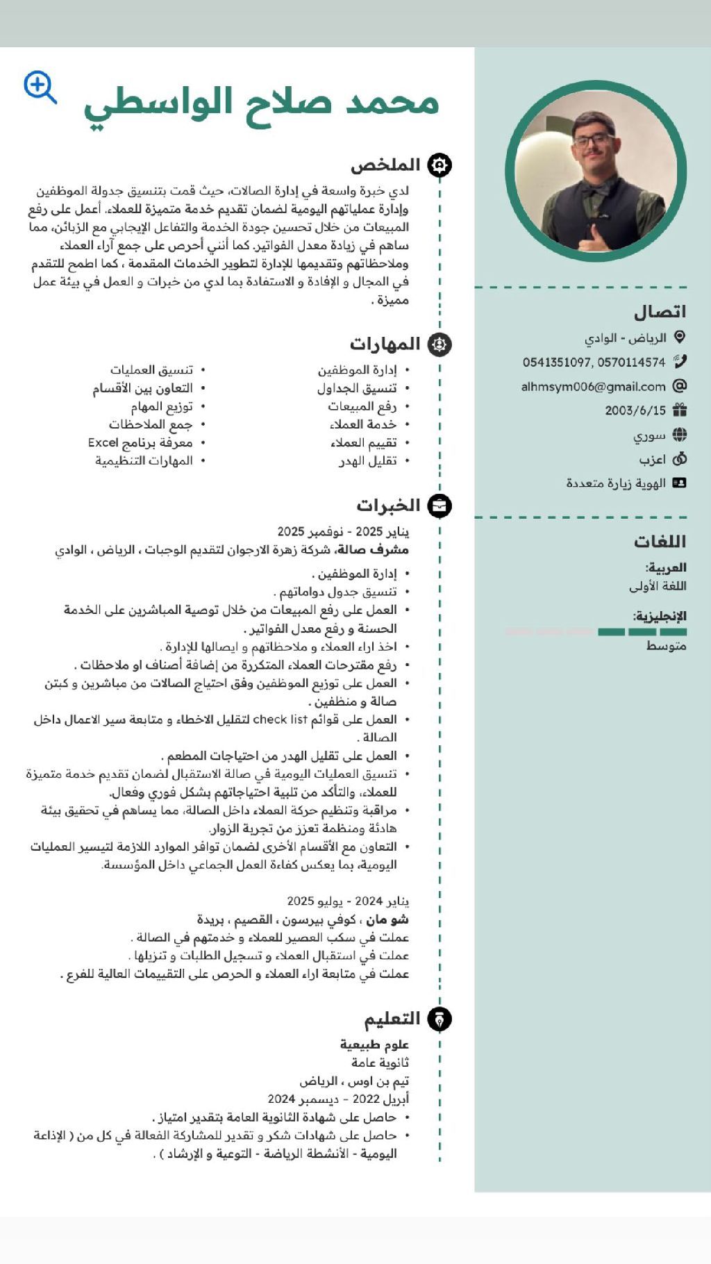 خبرة واسعة في ادارة الصالات في مطاعم ألد أين أن والفاست فود بالاضافة الى تنسيق الأعمال وجدولة الدوامات للموظفين والاشراف العام عليهم، خبرة في توزيع الأعمال وتنظيمها وتقسيمها، المام تام بأليات تقليل التكاليف ورفع المبيعات وتحسين الخدمة وتجربة العملاء، اطمع للعمل في بيئة عمل فعالة للتطوير من مهاراتي والافادة بما لدي من خبرات