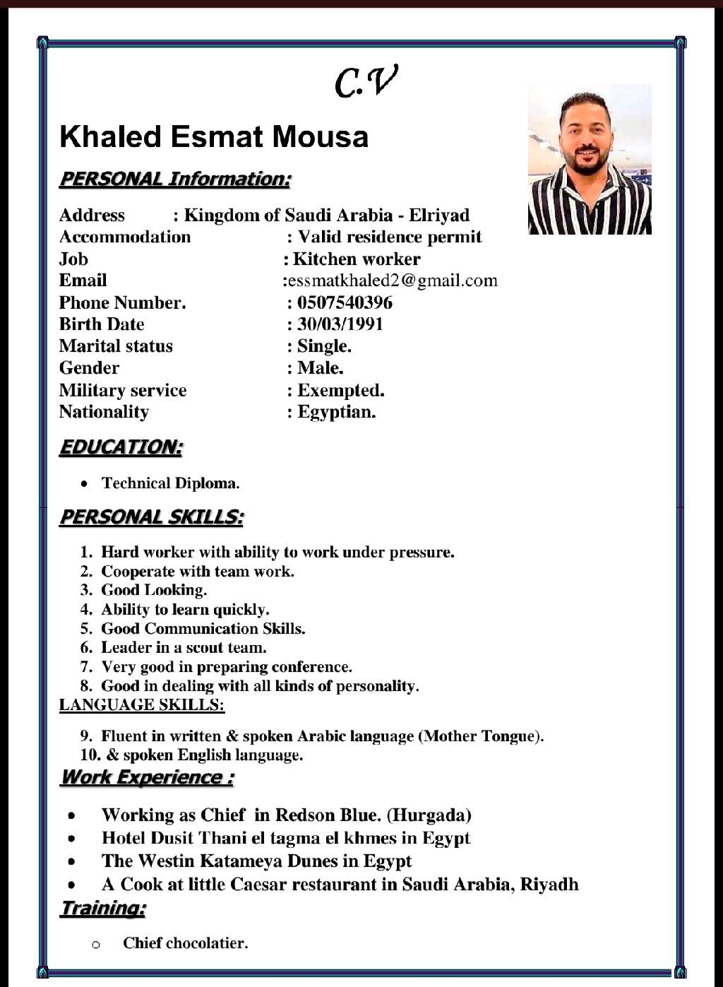 الاسم خالد الجنسية مصري الإقامة عامل مطبخ عملت في فنادق ومطاعم 5 STAR ولدي خبرة كبيرة في المطبخ حلواني والسخن والبيتزا متواجد في الرياض وجاهز للعمل في أي وقت ومكان