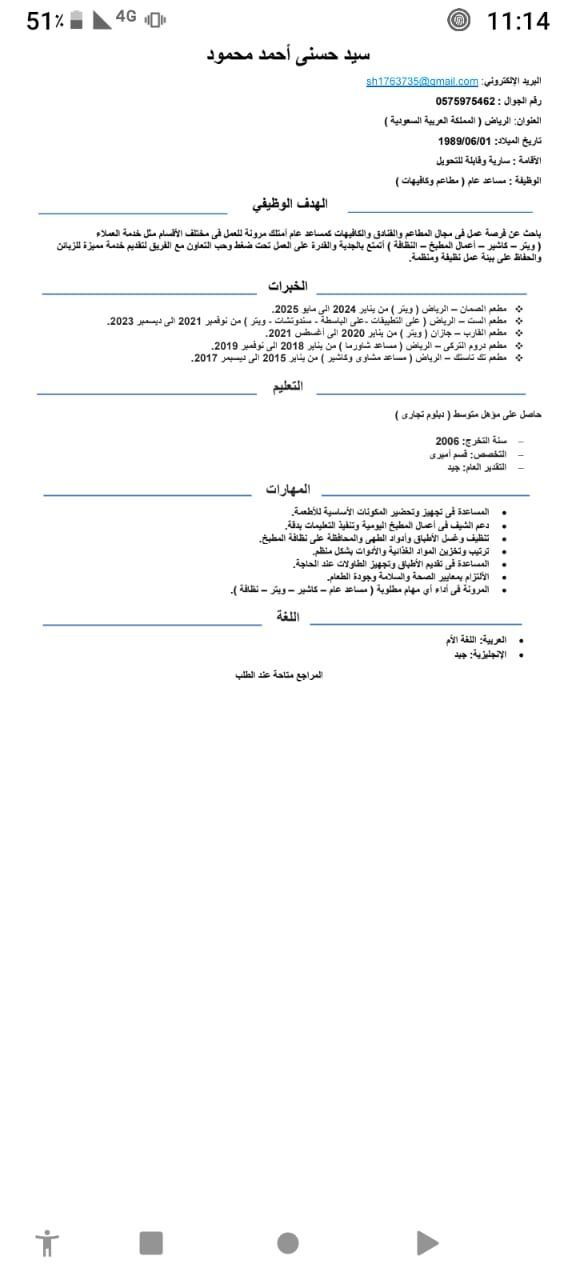 أنا من القاهرة ابحث عن فرصة عمل بالمطاعم. مشاوي أو شاورما. كمساعد. إقامة سارية