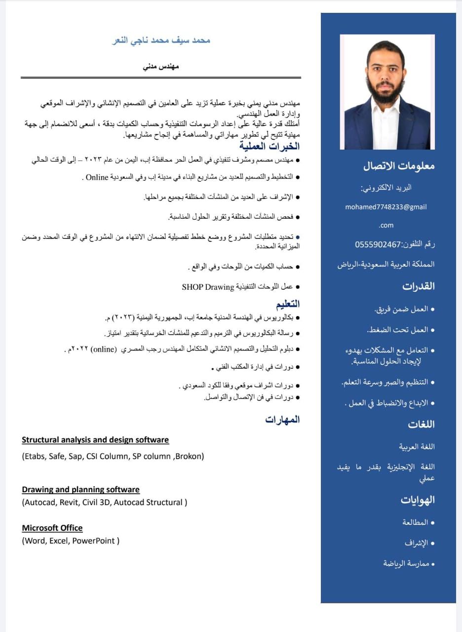 مهندس مدني يمني خريج 2023 خبرة سنتين في الاشراف الهندسي والتصميم الانشائي وحساب الكميات، محترف في البرامج الهندسية، وأجيد المهام التالية تصميم المنشاءات الخرسانية - اعداد الرسومات التفصيلية - الاشراف على تنفيذ الأعمال - استلام وتسليم الأعمال الهندسية - حساب الكميات من اللوحات وفي الواقع متواجد في الرياض
