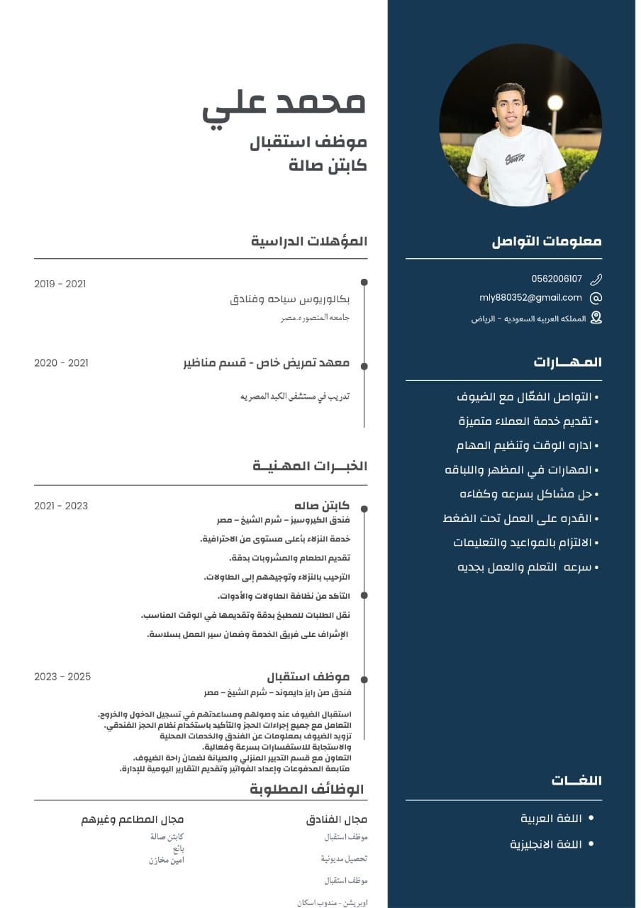 أنا كابتن صالة ومقدم طعام لدي خبرة 3 سنوات في مجال المطاعم والفنادق حاصل على بكالوريوس سياحة وفنادق المهارات التعامل الجيد مع العملاء العمل بروح الفريق والتعاون مع الزملاء نشيط وسريع التعلم تحمل ضغط العمل الالتزام بالمواعيد والتعليمات ابحث عن فرصة عمل مناسبة في مطعم أو فندق داخل الرياض جاهز للعمل فورا عمري 25 سنة مصري الجنسية