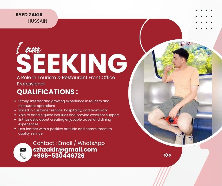 Tourism & Restaurant Professional - Dammam (Experienced and Reliable) I am an experienced professional based in Dammam with a background in customer service, supervision, and computer operations. I am looking for an opportunity in the tourism or restaurant industry, where I can apply my skills in client handling, coordination, and smooth daily operations. My experience includes working Supervisor