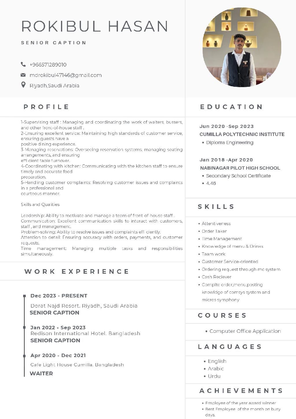I am Rakibul Hasan. I am a Captain Waiter. I have 5 years of experience in this job