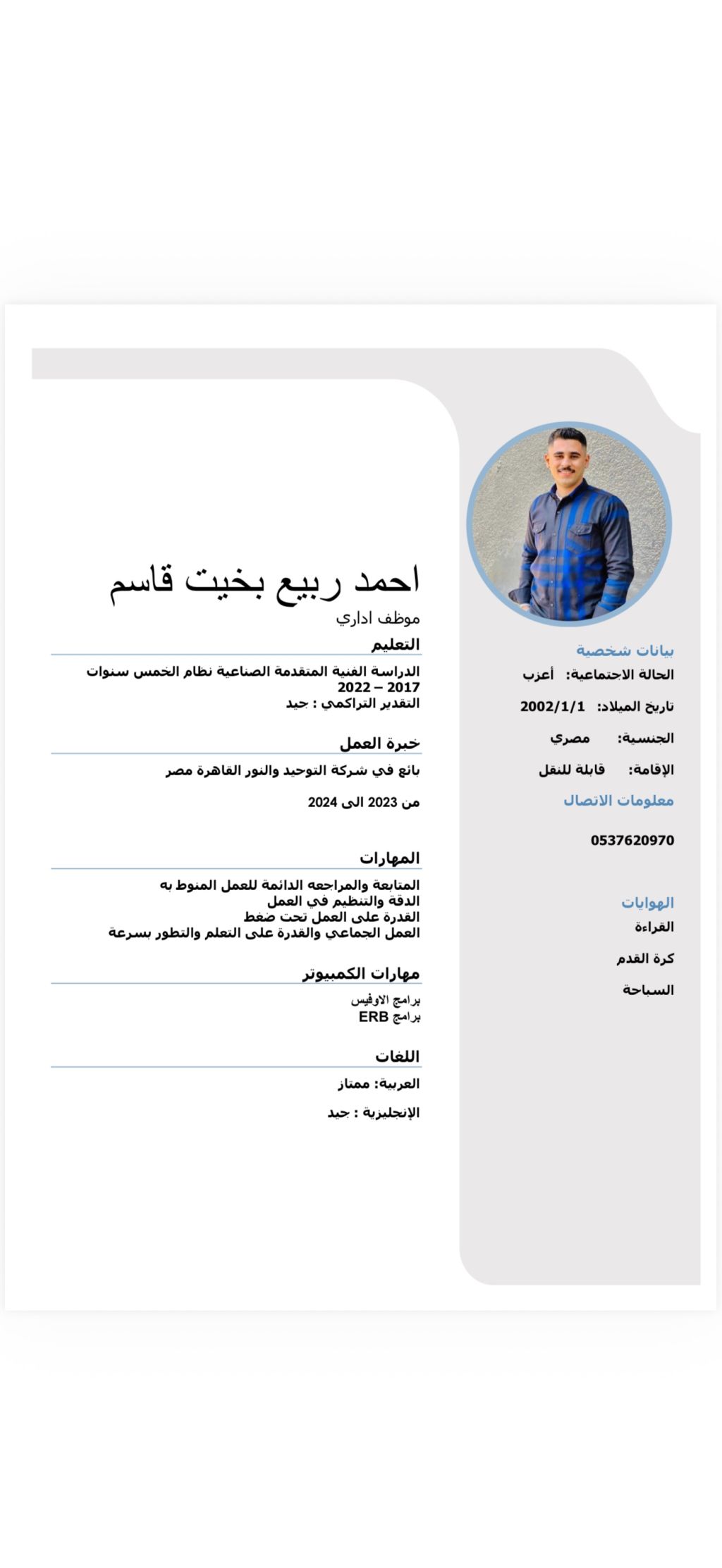 A 23 - year - old Egyptian man, a graduate with a post - secondary diploma, is seeking employment in the restaurant and hospitality sector in Riyadh. Experience 6 months of experience as a cashier in a cafe Experience in serving meals and customer service Skills Customer interaction Ability to work under pressure Commitment and discipline Teamwork skills Quick learner