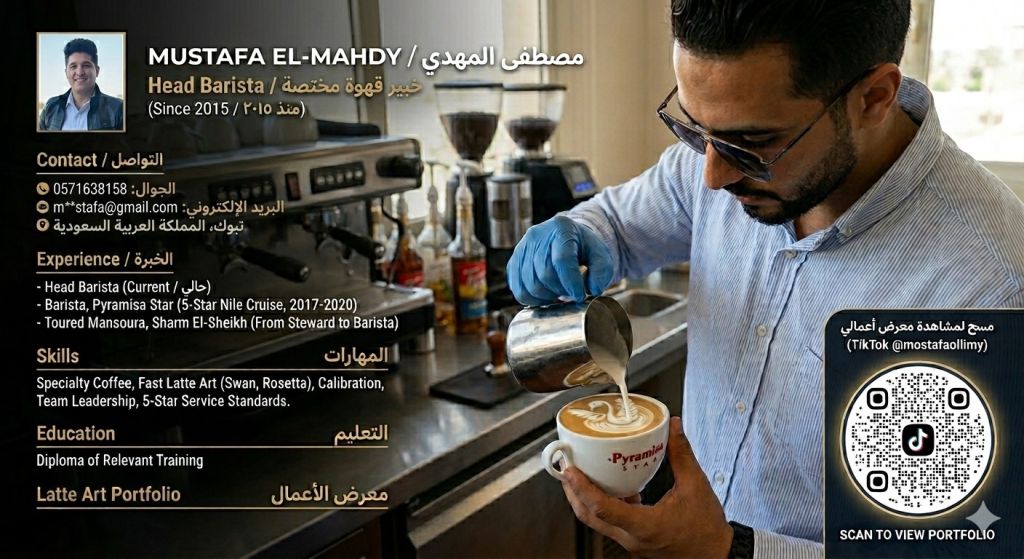 باريستا متخصص (Head Bar) بخبرة تمتد من 2015 في القهوة المختصة والفنادق 5 نجوم (بر أميزا ستار) متمكن من معايرة المطاحن وضبط الاستخلاص بدقة احترافية. أتميز بالسرعة الفائقة في الأداء مع اتقان فنون اللاتيه أرت (Latte Art) والجرنيه السريع. خريج سياحة وفنادق، لدي مهارات قيادية في إدارة البار وتدريب الفريق لضمان أعلى معايير الجودة. جاهز لنقل تجربتي والارتقاء بجودة المشروبات لديكم. للتواصل