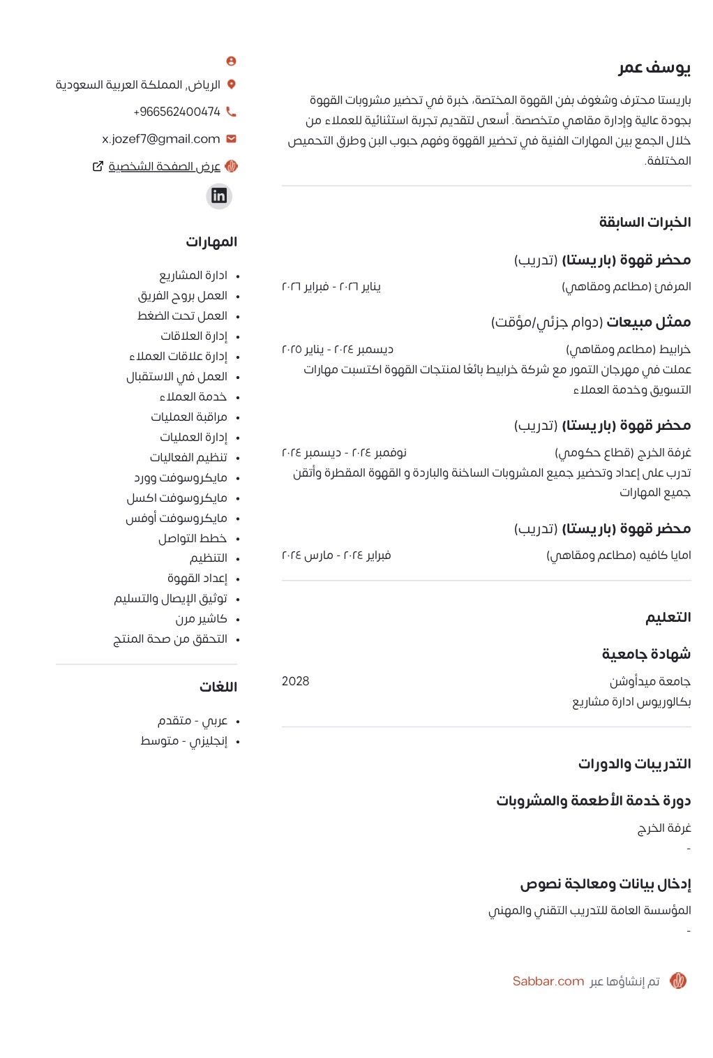 باحث عن عمل باريستا خبرة باريستا حاصل على دورة باريستا عملت سابقا أعرف ل المشاريب الحارة والباردة وأعرف الأرت لاتيه أجيد العمل على الكاشير وخدمة العملاء، ملتزم وجاد في العمل. خبرة سنة في الرياض