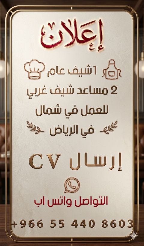 فرص وظيفية بمجال الطهي - شمال الرياض مطلوب للانضمام لفريقنا في شمال الرياض الكوادر التالية 1 شيف عام خبرة في إدارة المطبخ، تطوير المنيو، وضبط الجودة. 2 مساعد شيف غربي (عدد 2) مهارة في تحضير الأطباق العالمية والالتزام بمعايير الطهي الغربي. الموقع الرياض (حي الشمال) المتطلبات خبرة سابقة + الالتزام بمعايير النظافة والجودة. للتقديم يرجى إرسال السيرة الذاتية