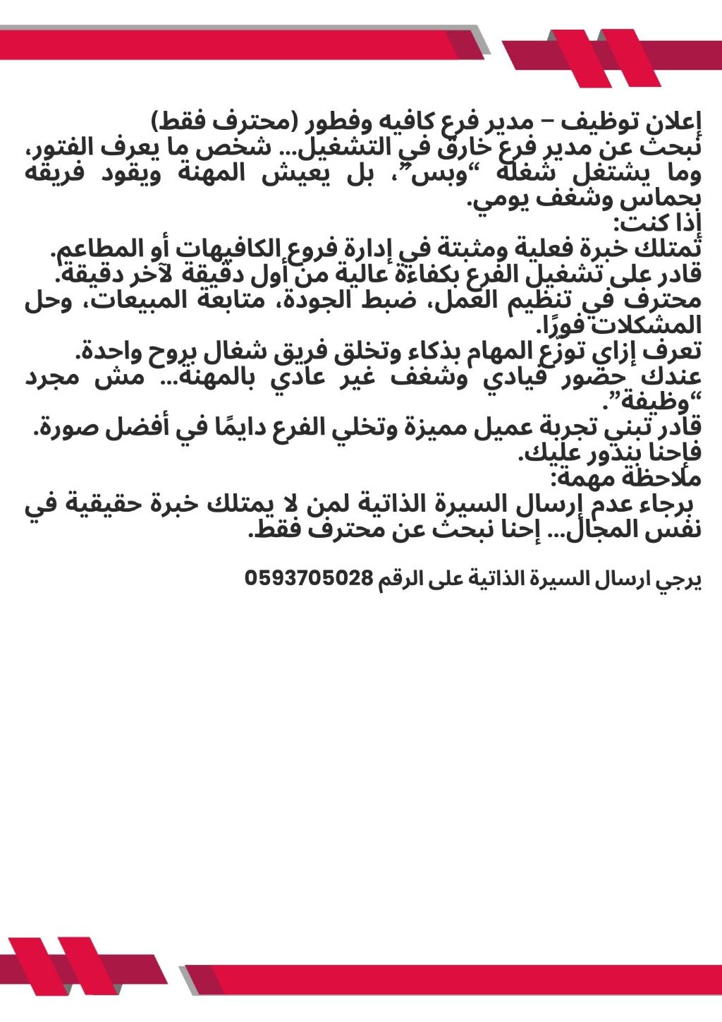 شركة مطاعم كبرى مطلوب بمنطقة الرياض حي الشهداء مدير فرع كافية وفطور (محترف فقط) نبحث عن مدير فرع خارق في التشغيل شخص ما يعرف الفتور، وما يشتغل شغله وبس، بل يعيش المهنة ويقود فريقه بحماس وشغف يومي. اذا كنت تمتلك خبرة فعلية ومثبتة في إدارة فروع الكافيهات أو المطاعم. قادر على تشغيل الفرع بكفاءة عالية من أول دقيقة لآخر دقيقة. محترف في تنظيم العمل، ضبط الجودة، متابعة المبيعات، وحل المشكلات فورا. تعرف أزاي
