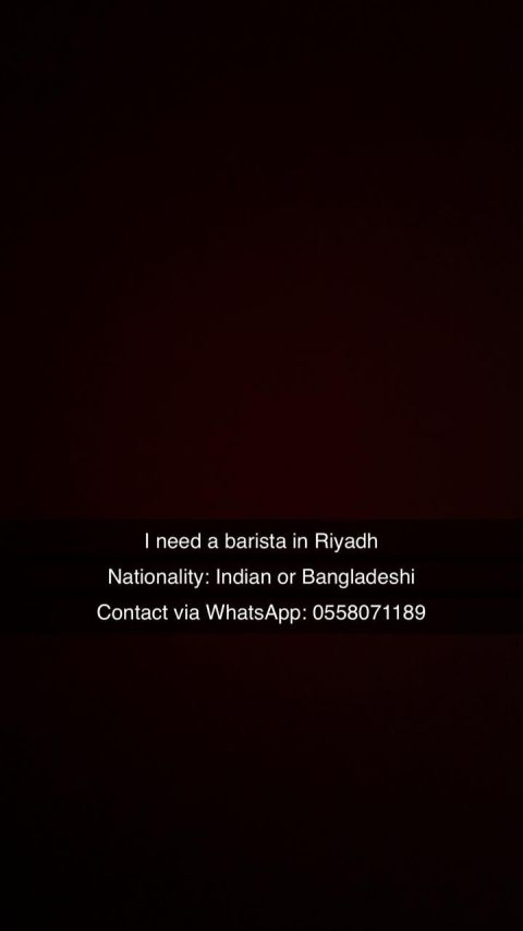 I need a barista (Indian or Bangladeshi nationality) in Al - Azizia neighborhood Riyadh. Contact via WhatsApp only