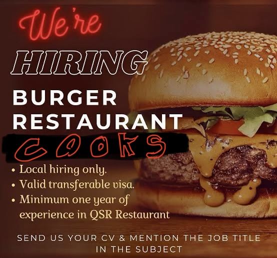 We are looking to hiring burger cooks in restaurant in Riyadh we are looking for Filipino and Indian Nepal nationality about the salary it’s good salary the interview it will be it will 12 p m on Sunday call me in my contact number put the WhatsApp only update me your CV restaurant in Saudi Arabia in Riyadh we have Vacancy for 10 em right now it’s available in Riyadh Hitten exit 2 - Turki round