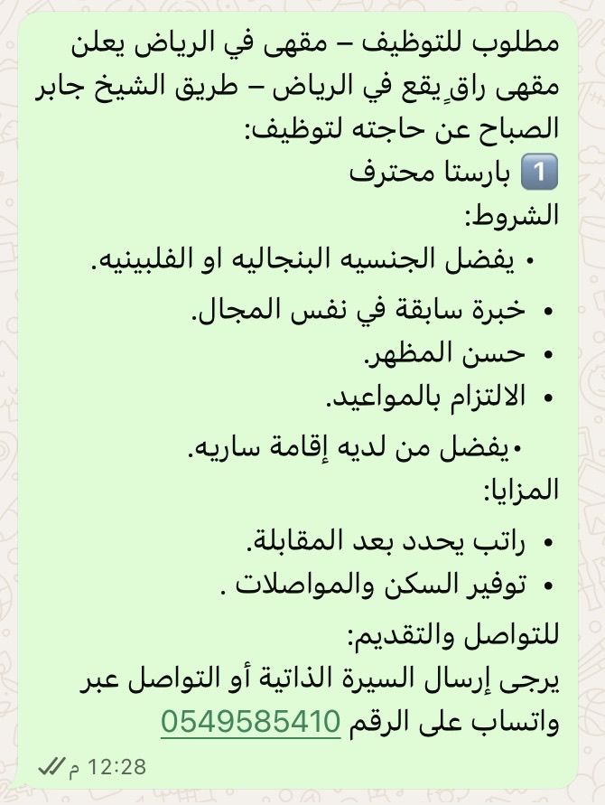 مطلوب للتوظيف مقهى في الرياض يعلن مقهى راق يقع في الرياض طريق الشيخ جابر الصباح عن حاجته لتوظيف باريستا محترف الشروط خبرة سابقة في نفس المجال. حسن المظهر. الالتزام بالمواعيد. يفضل من لديه إقامة سارية. المزايا راتب مجز يحدد بعد المقابلة. توفير السكن والمواصلات. للتواصل والتقديم يرجى إرسال السيرة الذاتية أو التواصل عبر واتساب فقط على الرقم وسوف يتم التواصل معك. يفضل الجنسية الفلبينية أو البنغاليه