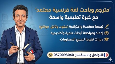 خدمات ترجمة احترافية ودقيقة (عربي فرنسي) ترجمة المستندات، المقالات، والمحتوى الرقمي. التزام تام بالمواعيد وجودة لغوية فائقة. خبرة في التعامل مع النصوص الأكاديمية والتقنية. للتواصل والاستفسار