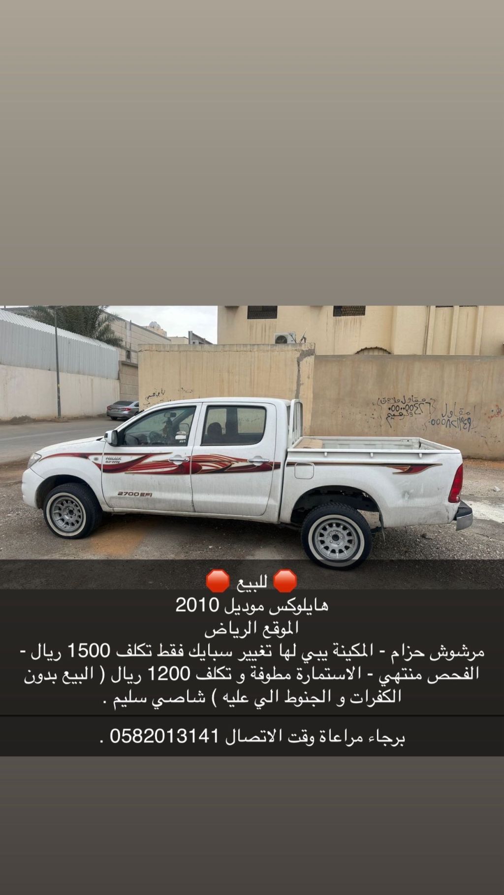 للبيع تويوتا هايلوكس 2010 غمارتين. السيارة مرشوشة حزام والمكينة فيها صوت. السبيكة تكلف 1500 ريال. الاستمارة والفحص منتهي التكلفة 1200 ريال.