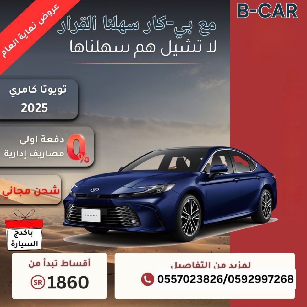 Camry Standard E 2025 with lease-to-own financing. Contact 0592997268. All types of cars available with lease-to-own financing. Own your car now. In cooperation with: 1 - Al Rajhi Bank, 2 - Riyad Bank, 3 - Al Ahli Bank, 4 - Emkan Company, 5 - Al Awwal Financing Company, 6 - Abdul Latif Jameel Financing Company, 7 - Al Arabi Bank, 8 - French Bank, 9 - Al Bilad Bank. For all bank customers without salary transfer. Lowest prices and lowest interest rates. No salary transfer required. No down payment.