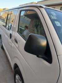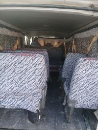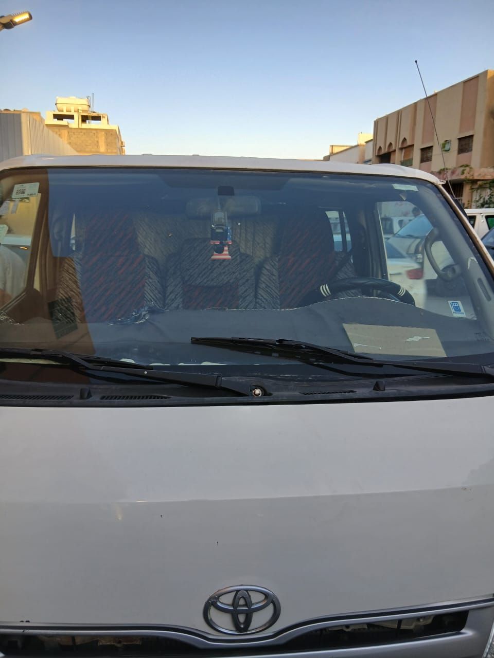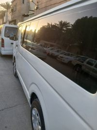 Toyota Hiace for sale, white color, 2011 model, diesel engine, excellent condition, with air conditioning, refrigerator, and very clean seats.