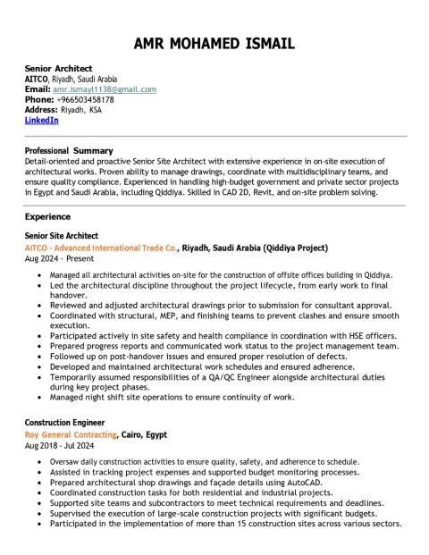 مهندس معماري خبرة أكثر من 11 سنة بتنفيذ الأعمال الانشائية والمعماريه بمواقع العمل المختلفة امتلك خبرة كبيرة في العمل بالمواقع الانشائية وادارتها ومراجعة الرسومات التنفيذيه والتنسيق بين كل الأقسام داخل مواقع العمل أجيد الانجليزية مقيم في الرياض وامتلك إقامة سارية حتى أول 2026 مسجل بهيئة المهندسين السعودين بوظيفة مهندس معماري