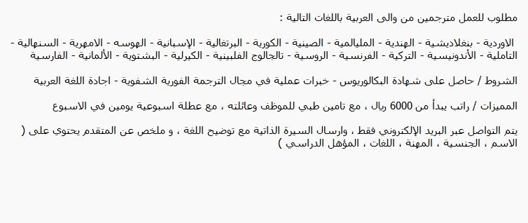 مطلوب للعمل مترجمين من والى العربية باللغات التالية الا وردية - بنغلاديشية - الهندية - المليا لمية - الصينية - الكورية - البرتغالية - الإسبانية - الهوسه - الامهرية - السنة ألية - التاميلية - الأندونيسية - التركية - الفرنسية - الروسية - تالجالوج الفلبينية - الكيرلية - البشتوية - الألمانية - الفارسية الشروط / حاصل على شهادة البكالوريوس - خبرات عملية في مجال الترجمة الفورية الشفوية - اجادة اللغة العربية