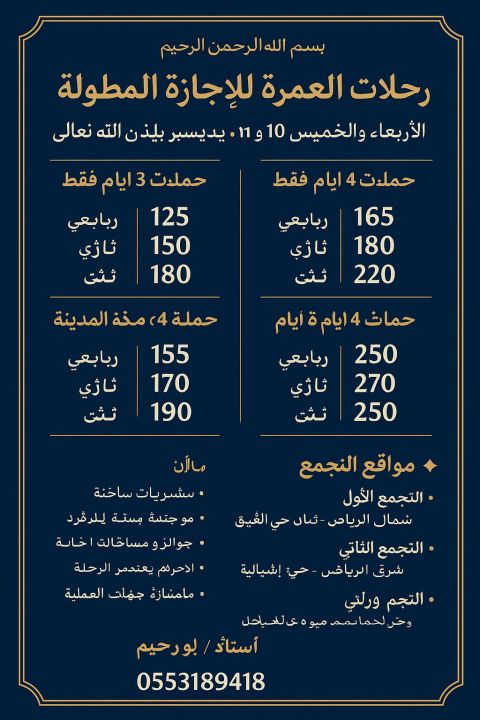 رحلات عمرة الإجازة الم طولة الى مكة والمدينة بأسعار مميزة وخدمات تشمل وجبة، مشروبات ساخنة، مسابقات، وإحرام مجاني للمعتمر لأول مرة. أسعارنا في متناول الجميع. للحجز أبو رحيم