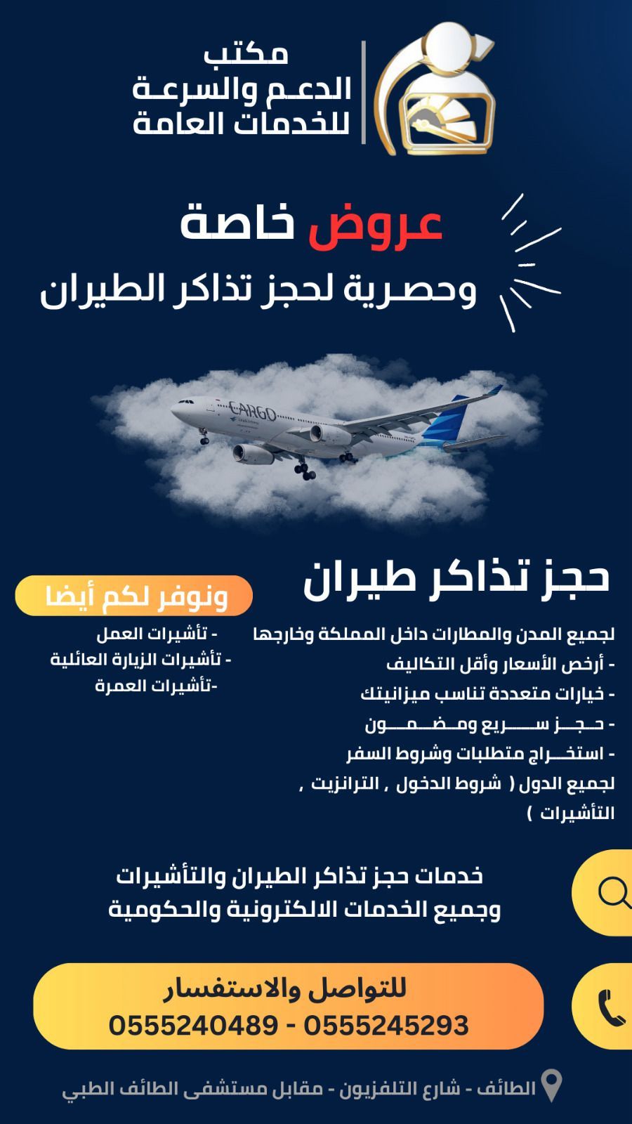 حجز تذاكر طيران لجميع الدول حجز تذاكر طيران لجميع المدن والمطارات داخل المملكة وخارجها أرخص الأسعار وأقل التكاليف خيارات متعددة تناسب ميزانيتك حجز سريع ومضمون استخراج متطلبات وشروط السفر لجميع الدول (شروط الدخول، الترانزيت، التأشيرات) انجاز مضمون بإذن الله نرحب بخدمتكم في جميع مناطق المملكة تواصل معنا عبر واتساب أو قم بزيارة المكتب ونخدمك بكل سهولة وموثوقية لزيارة المكتب الطائف - شارع التلفزيون