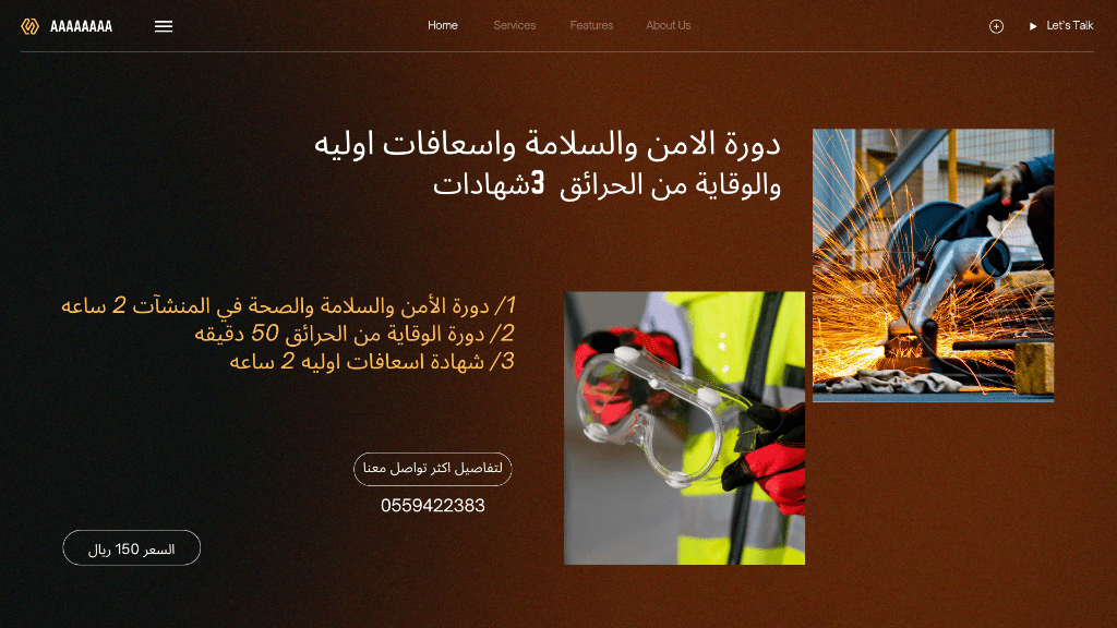 دورة الأمن والسلامة اسعافات أولية الوقاية من الحرائق 1 / دورة الأمن والسلامة والصحة في المنشاءات 2 ساعة 2 / دورة الوقاية من الحرائق 50 دقيقة 3 / شهادة اسعافات أولية 2 ساعة السعر 150 ريال لتفاصيل أكثر تواصل معنا 05594223