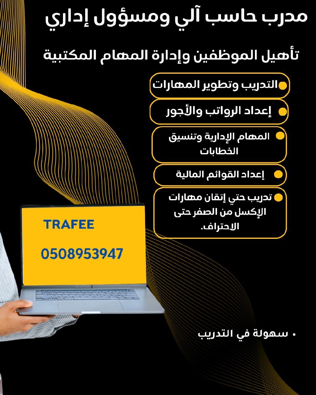 مدرب كمبيوتر تأهيل الموظفين للحصول علي وظيفة وإدارة المهام المكتبية التدريب وتطوير المهارات اعداد الرواتب والأجور المهام الادارية وتنسيق الخطابات اعداد القوائم المالية تدريب حتى اتقان مهارات الاكسل من الصفر حتى الاحتراف