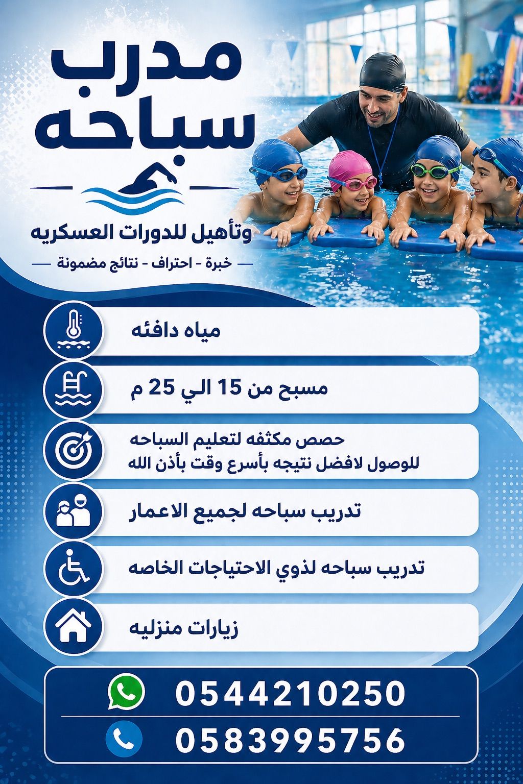 مدرب سباحة محترف، خبرة أكثر من 15 عام لجميع الاعمار والتأهل العسكري تعليمنا احترافي وممتع
