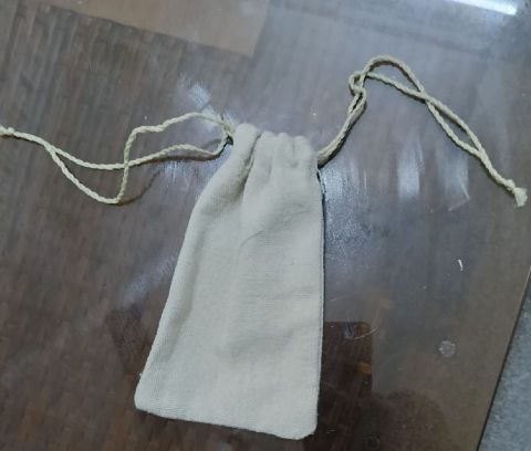 We have a quantity of plain burlap scarves with distinctive leather trim pieces that can be printed on. We also have large soft burlap bags lined with velvet, featuring an interior pocket, a leather handle, and a leather clasp with tape for a secure closure. Small gift bags are also available