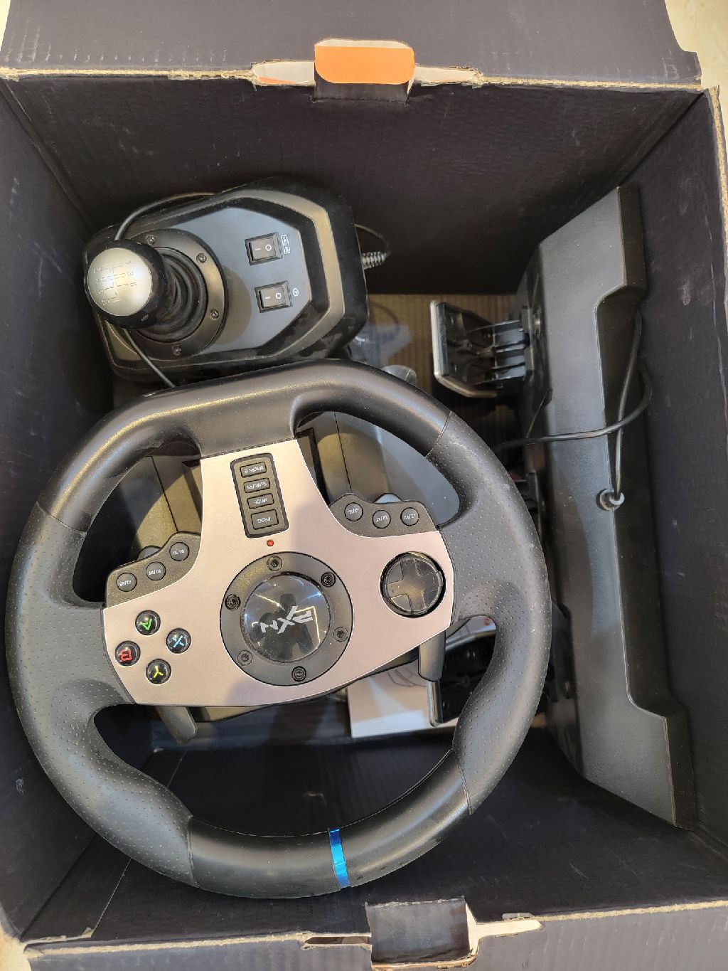 PXN V9 racing wheel set in excellent condition, used for less than one week only, almost brand new with no defects. Features Steering wheel + pedals (accelerator/ brake/ clutch) gear shifter 900 rotation for a realistic driving experience Strong force feedback with great road feel Compatible with PC - PS4 - PS3 - Xbox One Works perfectly with racing games like Assetto Corsa and more