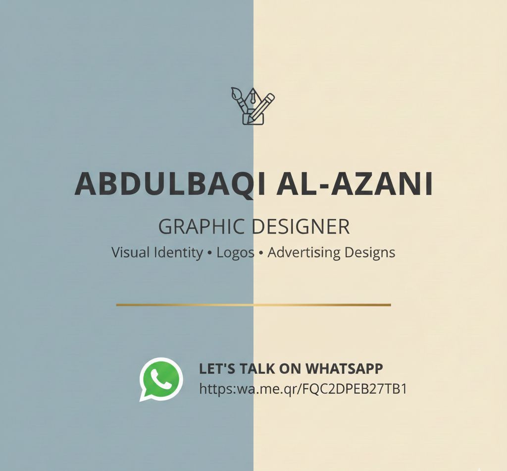حول رؤيتك الى واقع بصري مذهل هل تبحث عن تصميم يميز أعمالك المصمم عبد الباقي العزاني في خدمتك لتقديم حلول ابداعية واحترافية (هوية بصرية، شعارات، وتصاميم اعلانية) تناسب تطلعاتك. جودة عالية التزام بالمواعيد لمسات فنية فريدة للتواصل والاستفسار عبر واتساب مباشرة