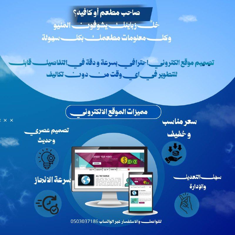 عايز موقع الكتروني يرفع شغلك ويجيب ليك زبائن أنا بقدم خدمة تصميم مواقع احترافية تصميم عصري وجذاب مناسب للجوال والكمبيوتر سرعة وأمان موقع يعبر عن شغلك ويزيد ثقة العملاء سواء عندك مطعم أو كوفي ممكن نصمم ليكم مينوا الكتروني احترافي ولوعندك متجر أو مشروع أو شركة أنا برتب ليك موقع مرتب وجاهز خلال أيام أتواصل معنا عبر