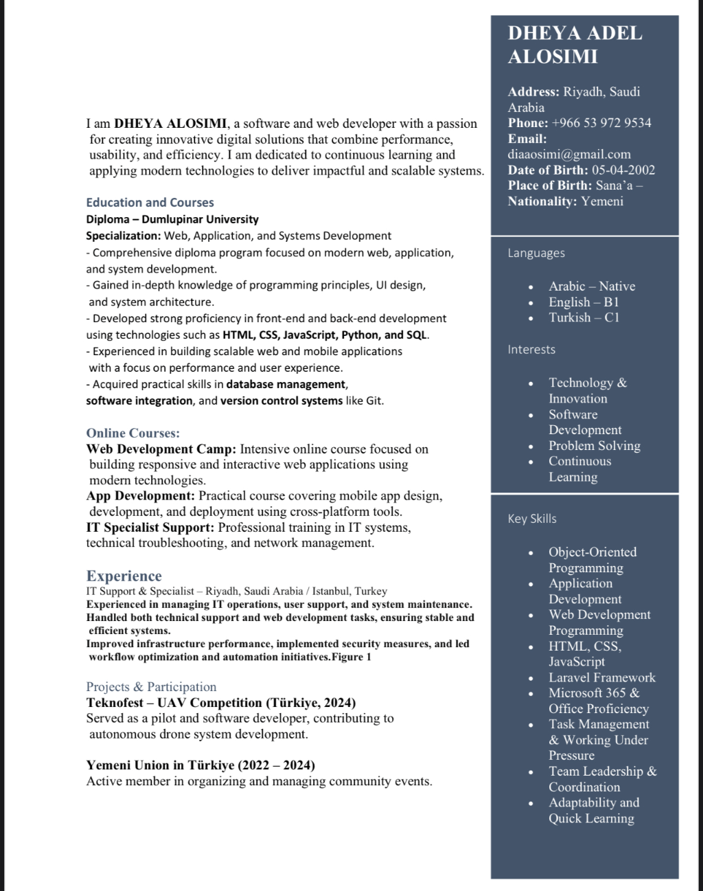 مطور مواقع وبرمجيات + دعم تقني IT. خريج دبلوم Web / App/ Systems. مهارات HTML / CSS/ JS، Python، SQL، Laravel، Git. لغات عربي، تركي C1، انجليزي B1