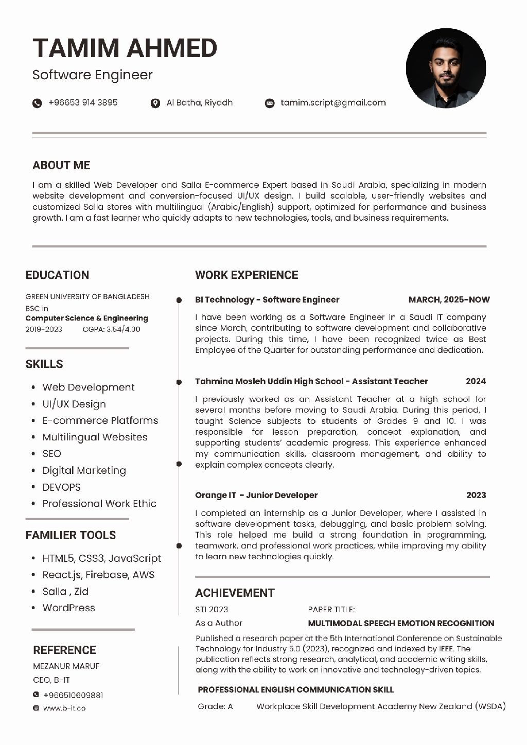 مطور مواقع الكترونية وخبير مقيم في المملكة العربية السعودية، يتمتع بخبرة واسعة في تصميم واجهات المستخدم وتجربة المستخدم، وتطوير مواقع الكترونية قابلة للتوسع، وانشاء متاجر الكترونية متعددة اللغات (العربية والانجليزية) وتحسين الأداء، والقدرة على التكيف السريع مع التقنيات الحديثة. اذا كنت ترغب في انشاء متجر الكتروني على منصة "صلى" أو أي منصة أخرى، يرجى التواصل معي. لقد صممت لك كل شيء من البداية إل