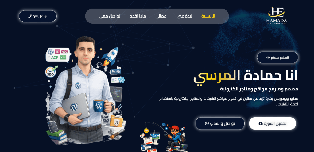 أنا حمادة المرسي مصمم ومبرمج مواقع ومتاجر الكترونية مقيم حاليا في الرياض ومتاح للعمل داخل المملكة بدوام كامل، أو بالمشاريع اذا كنت تريد انشاء موقع الكتروني احترافي لشركتك تواصل معي الآن