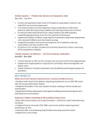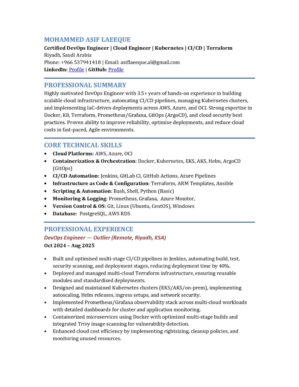 Certified DevOps Engineer with 4 + years of hands - on experience in designing, implementing, and managing scalable, secure, and highly available cloud and on - premise infrastructures. Proven expertise in CI/ CD pipeline automation, cloud services, containerization, infrastructure as code, and system reliability engineering, enabling faster deployments and improved system stability. Extensive experience