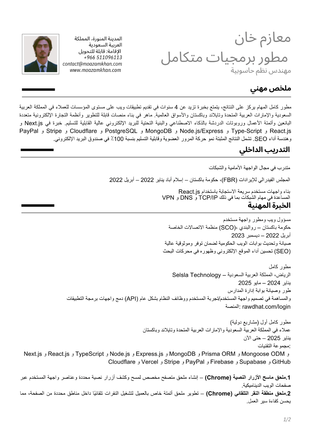 أنا منفتح على أدوار تطوير المواقع الالكترونية في المملكة العربية السعودية، حيث يمكنني تطبيق خبرتي التقنية، والتعاون بفعالية مع الفرق المهنية، والمساهمة في بناء حلول رقمية موثوقة وقابلة للتوسع. خدمات تطوير الويب المتخصصة مع أكثر من 4 سنوات من الخبرة العملية في تقديم مواقع ويب عالية الأداء، عملت بنجاح مع عملاء وفرق متنوعة لبناء حلول ويب حديثة واستجابة وفعالة. اعمل حاليا كمدير تكنولوجيا المعلومات في برج