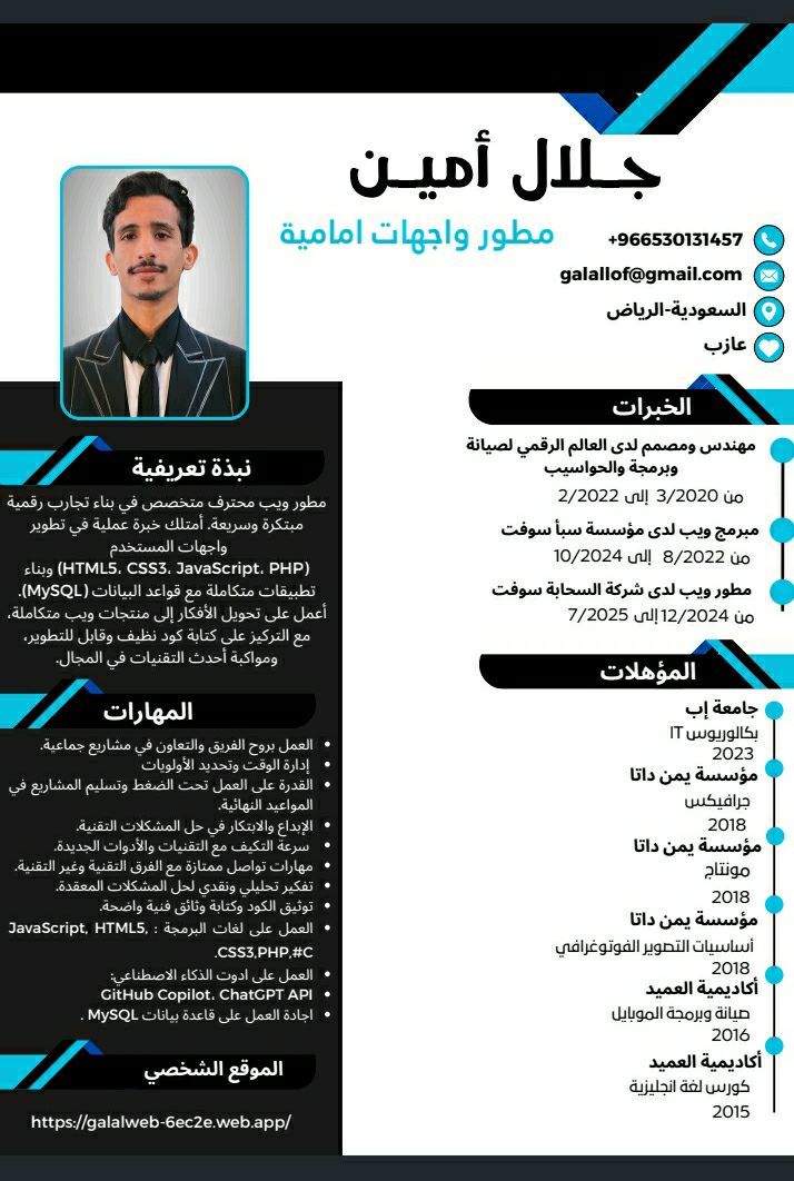 مطور واجهات أمامية ومبرمج ويب بخبرة عملية في تطوير المواقع والتطبيقات باستخدام HTML 5، CSS3, JavaScript, PHP, MySQL بالاضافة الى تطوير تطبيقات سطح المكتب باستخدام C امتلك خبرة في بناء أنظمة متكاملة كتابة كود نظيف وقابل للتطوير، والعمل ضمن فريق أو بشكل مستقل لدي خلفية أكاديمية في تقنية المعلومات وأسعى للانضمام الى جهة احترافية لتقديم حلول برمجية فعالة ومبتكرة
