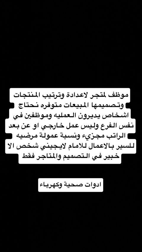 اعلان وظيفي مطلوب خبير متجر الكتروني نبحث عن موظف محترف للعمل في متجر الكتروني قائم بالفعل في الرياض - حي المنصورة، لديه خبرة عملية في انشاء وإدارة المتاجر الالكترونية تصميم المنتجات وعرضها بشكل احترافي وجذاب كتابة وصف تسويقي مقنع للمنتجات ترتيب المنتجات داخل المتجر بطريقة تزيد من فرص الشراء (العمل حضوري) المتجر لديه مبيعات حاليا فقط نرغب بالتطوير وأشخاص ينفذون بشكل احترافي