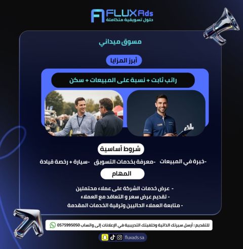 مطلوب مسوق ميداني للعمل في شركة دعاية واعلان تصميم لوحات المحلات والبنرات وبزنس كارد والبر وشاور العمل الرياض حي الحمراء