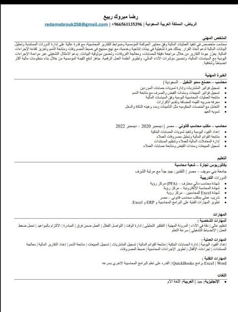 محاسب مصري حديث التخرج بكالوريوس تجارة، لدي خبرة عملية في تسجيل القيود اليومية بدقة. تسجيل المشتريات والمبيعات ومتابعة المصروفات والايرادات التعامل مع ضريبة القيمة المضافة. متابعة حسابات العملاء والموردين وتسوية الأرصدة. متابعة الرواتب وتسوية الحسابات البنكية. القدرة على استخدام بعض البرامج المحاسبية وبرامج الأوفيس أتميز بالدقة، والالتزام، وتنظيم المستندات والقدرة على التعلم السريع وتحمل ضغط العمل